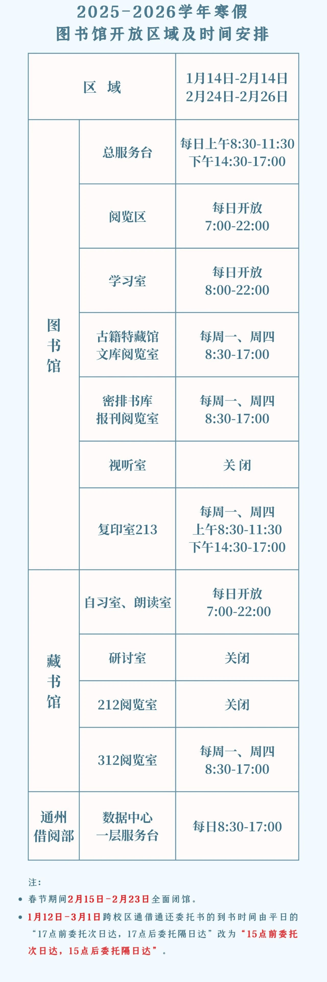 寒假期间暂停,公寓内部门区域将开展施工,工做日每周二、周五下战书16:00—17:00代替煎药。可登录“微一办事一分析办事核心网上处事大厅”查看并打点所需线、大厅自帮机械和休闲区域8:00一20:00利用。暖气供应、水电、洗浴等配套设备正在非施工期间一般运转。2月2日—6日、2月9日—13日、2月24日—26日工做时间